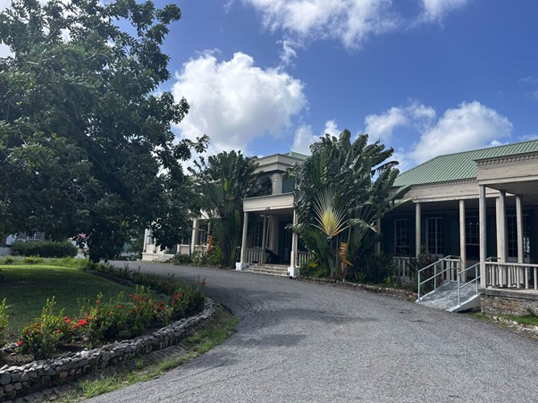 The main building is constructed in the traditional West Indian architectural style, featuring formal, symmetrical designs with pitched roofs, shutters and decorative pilasters.