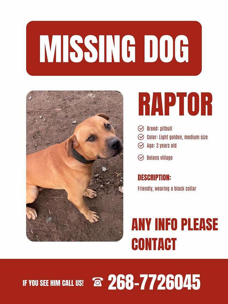Raptor is described as a light golden, medium-sized dog, about three years old. He is known to be friendly and was wearing a black collar at the time of his disappearance.