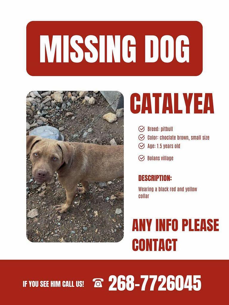 Catalyea, a smaller chocolate-brown pitbull, is approximately one-and-a-half years old. She was last seen wearing a black, red and yellow collar.