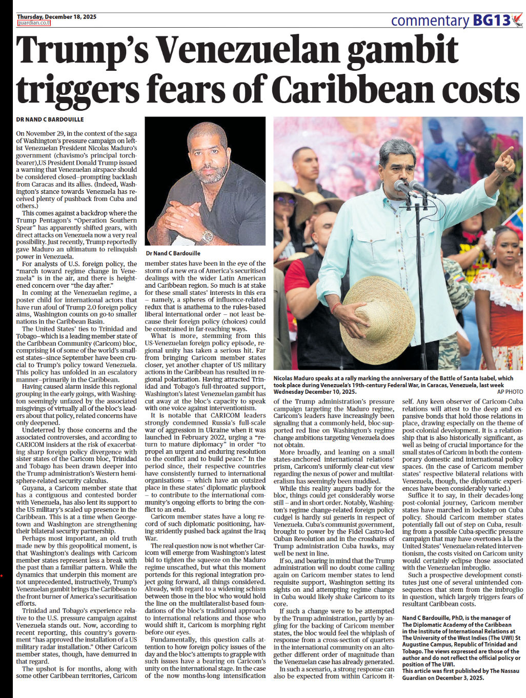 - ‘The Perils of the Trump-Maduro Showdown for CARICOM’. Trinidad and Tobago Guardian (November 20, 2025).