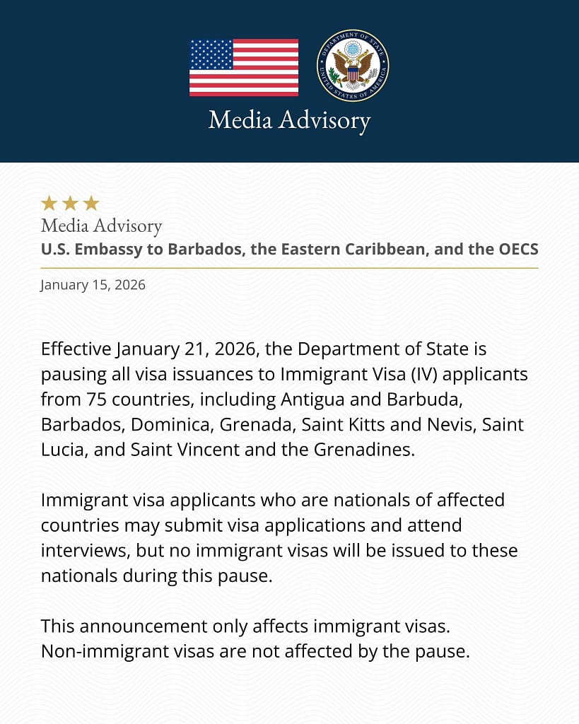 U.S EMBASSY BRIDGETOWN: Effective January 21, 2026, the Department of State is pausing all visa issuances to Immigrant Visa (IV) applicants from 75 countries, including Antigua and Barbuda, Barbados, Dominica, Grenada, Saint Kitts and Nevis, Saint Lucia, and Saint Vincent and the Grenadines.
