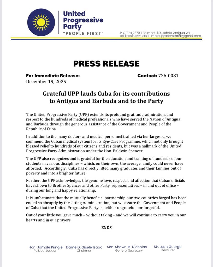 The United Progressive Party (UPP) extends its profound gratitude, admiration, and respect to the hundreds of medical professionals who have served the Nation of Antigua and Barbuda through the generous assistance of the Government and People of the Republic of Cuba.