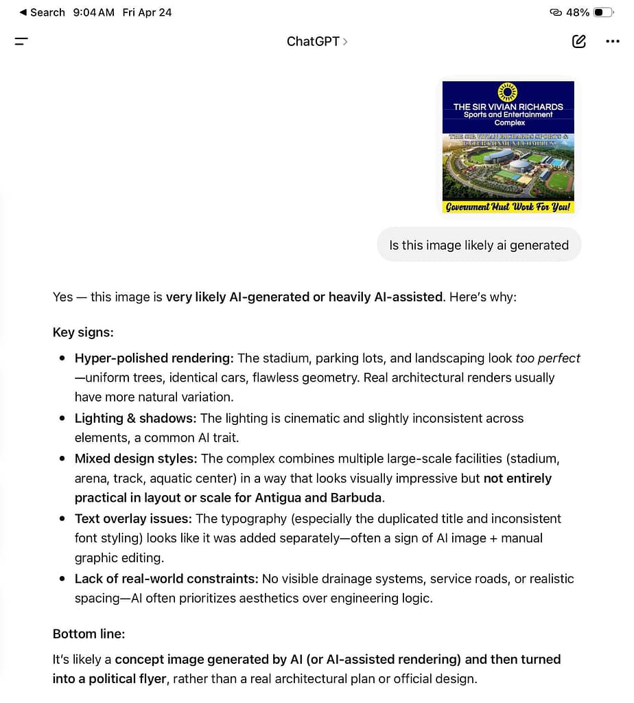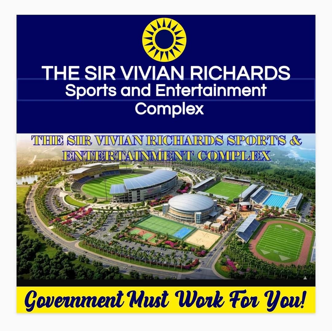 The image, labeled “The Sir Vivian Richards Sports and Entertainment Complex,” depicts an expansive development featuring a stadium, track, tennis courts and other facilities. It has been shared in political exchanges ahead of the April 30 general election.