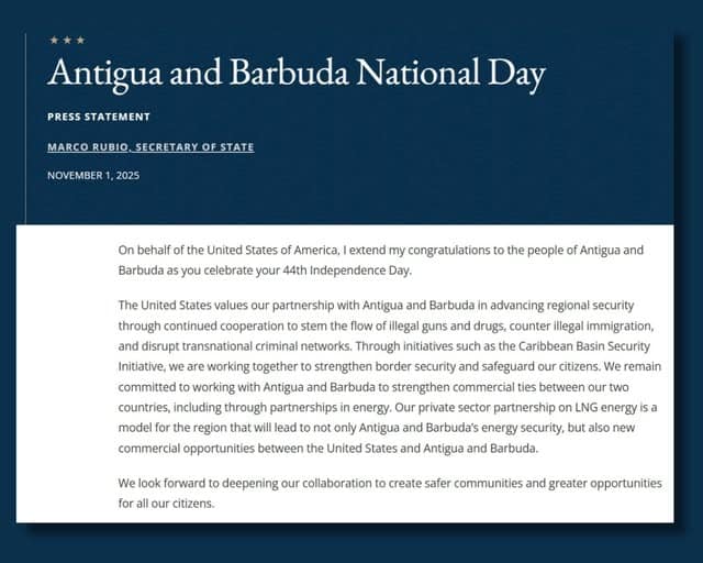 In a statement issued on Friday, US Secretary of State Marco Rubio reaffirmed Washington’s commitment to strengthening ties with St John’s, highlighting cooperation on regional security and economic development.