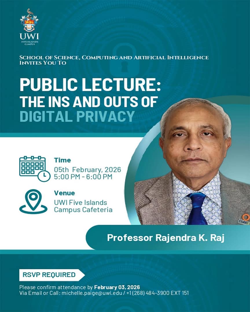 The lecture, titled “The Ins and Outs of Digital Privacy,” will be delivered by Professor Rajendra K. Raj and is scheduled for February 5, 2026, from 5:00 p.m. to 6:00 p.m. at the UWI Five Islands Campus Cafeteria.